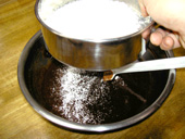 小麦粉とベーキング・パウダーをふるい4に加え粉が見えなくなり、少しつやが出るまで混ぜる。